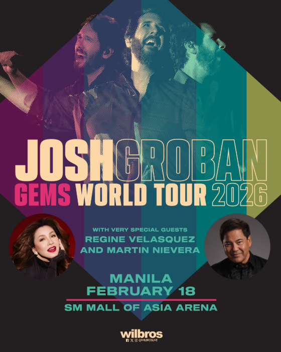 Tony, EMMY and five-time GRAMMY Award-nominated singer-songwriter Josh Groban brings his newest tour ‘GEMS WORLD TOUR’ to Manila and announces his very special guests ‘Asia’s Songbird’ Regine Velasquez and ‘Concert King’ Martin Nievera for a must-see Valentine’s week concert on February 18, 2026 at the SM Mall of Asia Arena. Presented by Wilbros Live.